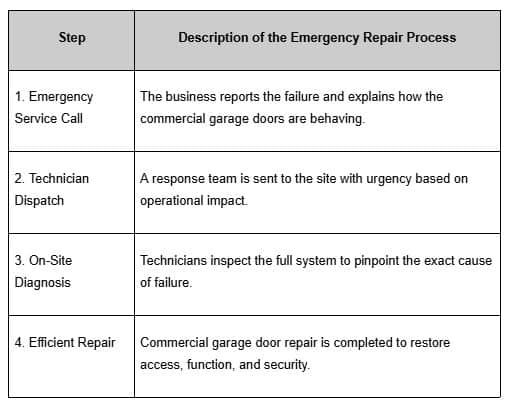 Recovery is measured by how fast function and security return, which is why the process centers on efficient diagnosis and repair rather than temporary workarounds. A focused emergency response limits the spread of disruption, especially when the door is tied to deliveries, service bays, or end-of-day closure. The sections that follow explain how emergency commercial garage door repair usually plays out and how a professional crew moves from assessment to restored operation, so access is regained and the site feels secure again.