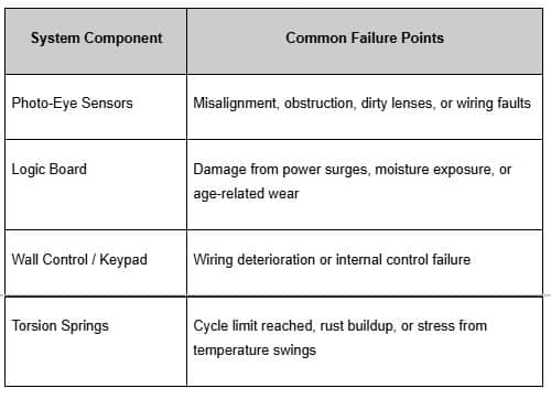 Electrical failures can still surface after routine service when an underlying defect goes unnoticed or when environmental stress affects sensitive components, which is why professional diagnosis matters once the door behaves inconsistently. A control board issue, for example, can imitate a mechanical problem, and a compromised sensor can make a healthy door appear unsafe to operate, causing sudden shutdowns even though the hardware is still physically capable of moving. To make the common failure points clearer, hereโs how the major system components tend to break down in commercial settings: